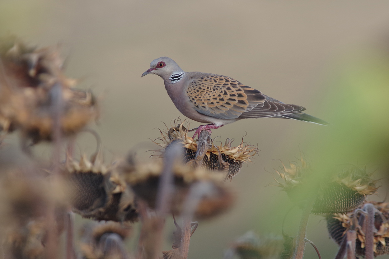 La foto è stata scattata lungo una strada che percorre un crinale a sud di Fermo dove io ed altri amici passiamo la primavera e i primi caldi estivi ad osservare la migrazione dei rapaci che in discreto numero passano. Quel giorno il cielo era stato particolarmente avaro e me ne stavo andando via quando due tortore mi sono volate davanti alla macchine ed una si è posata su dei girasoli li vicino, è stato un attimo prendere la macchina fotografica e scattare due foto prima che si involasse.