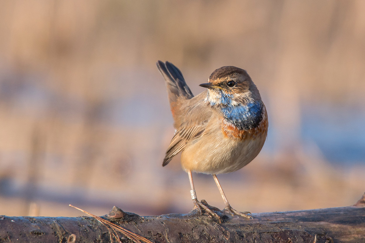 Lo avevo visto solo una volta di sfuggita a Ventotene 4 anni fa. Questa volta non volevo mancare l’appuntamento, anche perché averlo qui alla Sentina nel giro di pochi mesi era come un invito a nozze. Il sole era sorto da poco quando io e Mina eravamo già nel capanno. I posti migliori per le foto erano già occupati dai fotografi, ma per una volta a me interessava soprattutto vederlo. E da lì a poco, questo splendido esemplare ha iniziato a fare capolino dal canneto. Il pettazzurro è un passeriforme della famiglia dei Turdidae (come l’usignolo, il pettirosso, i codirossi…) che frequenta acquitrini con canneti.